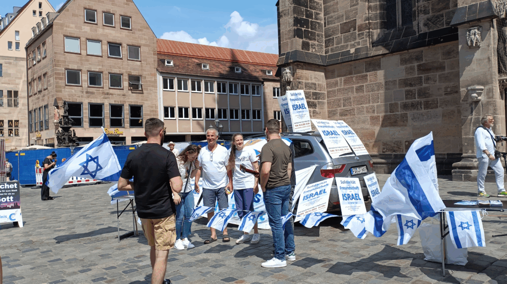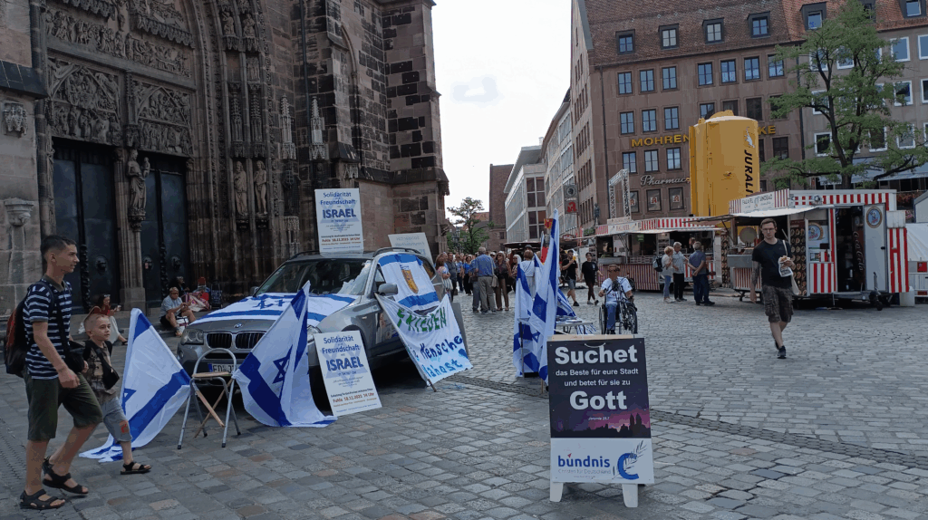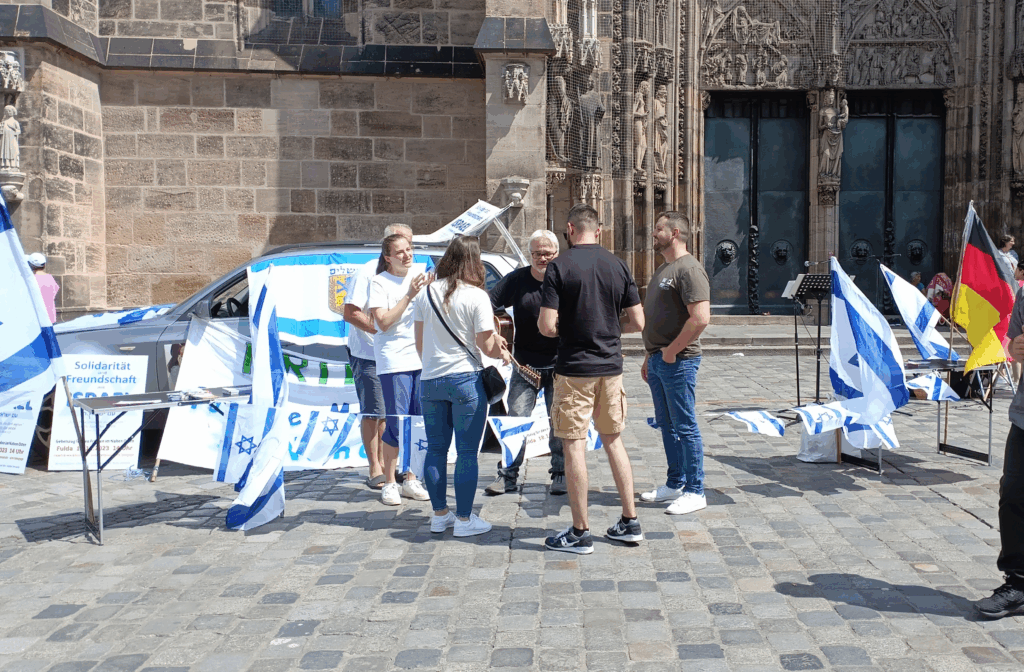 Insbesondere Touristen aus Israel sowie jüdische Mitbürger und Nürnberger Christen freuten sich über unsere Präsenz und unseren Mut, in Zeiten wie diesen öffentlich an der Seite Israels zu stehen. Einige Iraner machten Fotos mit den zahlreichen Israelfahnen an unserem Stand, da sie im Gegensatz zur Regierung ihres Heimatlandes den Staat Israel respektieren und unterstützen.