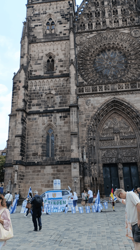 Auf Initiative von Dr. Norbert Höhl hatte der Bezirksverband zu einer Demo in Nürnberg vor der Lorenzkirche eingeladen mit dem Thema „Nürnberg steht an der Seite Israels“. Mit Israelfahnen, Transparenten, christlichen und jüdischen Liedern, die von Michael Krug vorgetragen wurden, bekundeten wir in aller Öffentlichkeit unsere Liebe, herzliche Freundschaft und uneingeschränkte Solidarität mit Israel.